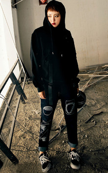 宽松连帽卫衣,自由剪裁,小破洞镂空设计,面料十分舒适,搭配一款个性牛仔裤,街头潮人就是你