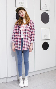 活力满满的格子衬衫,总是会让人想到学生年代,非常的减龄。内穿百搭的白色T恤,下搭修身牛仔裤,拉长身高比例,青春气息满满。