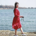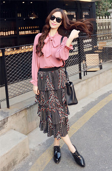 领口系带款纯色衬衫,搭配一条长款百褶半身裙,尽显优雅女人味,吸睛搭配,展现出十足的文艺范。
