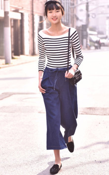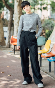 最简单最百搭的打底针织衫,细致螺纹肌理,简约却不单调,面料的质感柔软舒适,搭配蓝色阔腿裤,休闲范十足
