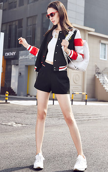 时尚立领,红白黑拼接撞色棒球服,搭配透视雪纺拼接t恤,穿条中腰阔腿短裤,街拍欧美潮范。