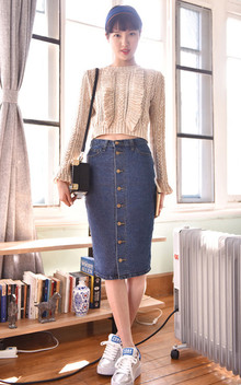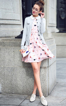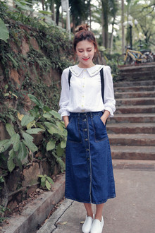娃娃领的可爱感,加上精致的绣花,清新怡人,搭配有设计感得单排扣双口袋牛仔长裙,很独特呢,加上平底的乐福鞋清新脱俗吖~