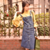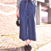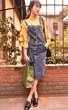中长款牛仔背带裙,很有青春情怀的一款牛仔背带裙,看似直筒却有修身效果,搭配灯笼袖套头长袖衬衫,超级减龄,俏皮可爱的。
