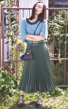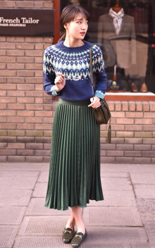 这款毛衣一见到就非常喜欢,经典的名族风几何图案,质感非常柔软,配上墨绿色的半身裙,文艺范十足