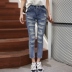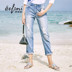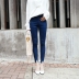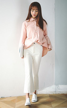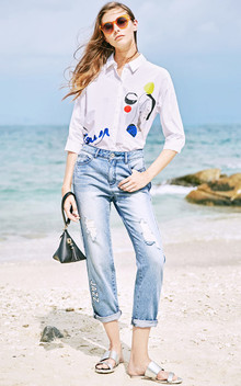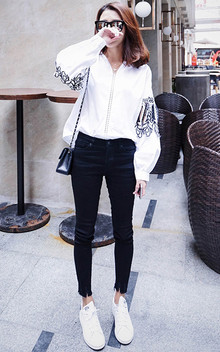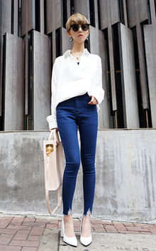 简洁干净的白衬衫,没有多余的装饰,很好驾驭,搭配小脚牛仔裤,裤腿毛边的装饰,个性时尚。