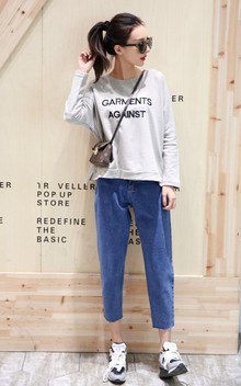 韩版的蝙蝠袖上衣,简单的字母图案,休闲百搭,搭配个性的宽松牛仔裤,随意个性~
