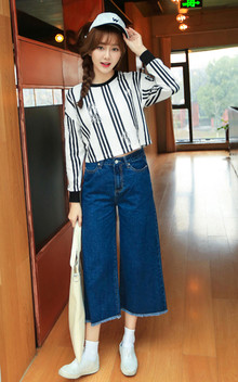 清新的印花卫衣,优质的面料,穿着很舒适,搭配休闲阔腿裤,牛仔的面料,尽显韩版风范儿,出街很休闲。