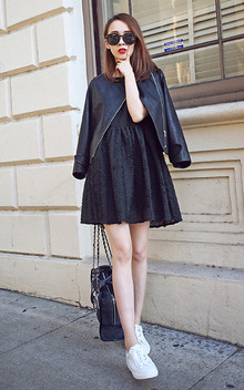 短款机车皮衣,斜拉链的设计,简洁干练,上身很帅气,搭配时髦的小黑裙,高腰打造黄金身材比例。