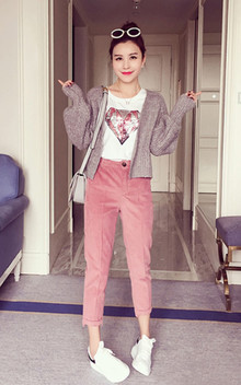 温暖的开衫外套,在早春的季节里看着都让人觉得暖暖的搭配多图案时尚俏皮亮片短袖T恤和灯芯绒小脚休闲长裤时尚又有范