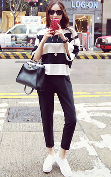 黑白横条纹短款休闲针织衫,宽松的版型,面料舒适柔软薄厚适中,搭配一条黑色休闲裤,显瘦又遮肉