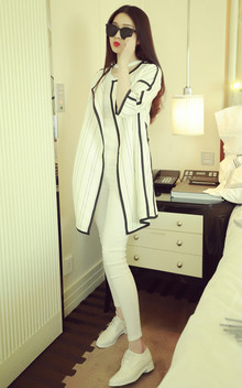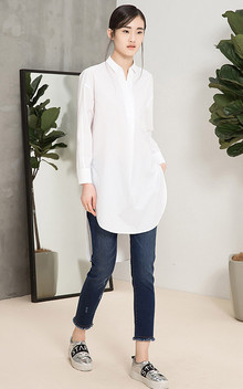 韩版中长款衬衫,纯白色显得简单又纯净,大圆弧的开叉下摆设计又不失个性,下身搭配牛仔裤,休闲与柔美的完美结合