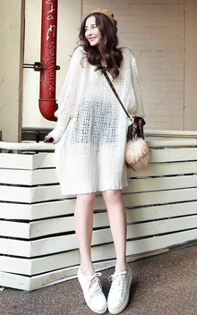 小慵懒感的中长款针织衫,小透视感镂空样式,宽松衣身及灯笼袖设计,非常的洋气漂亮,内搭背心短裤,街头范十足