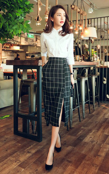 裙子腰部的波浪形设计很抢眼,前开叉隐约露出全身最瘦的小腿。搭配T恤或者衬衫毛衣外套都OK,一般身材的MM都能轻松驾驭。