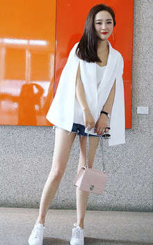 这款白色西装,打破单板印象,融入休闲元素,斗篷型上衣内搭白色打底衫下搭高腰牛仔短裤,脚着经典百搭小白鞋,帅气的街头风!