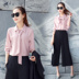 纯色百搭衬衫,经典的翻领设计,简约干练,胸前口袋显得落落大方,前短后长的下摆显出几分俏皮,搭配格子半裙,优雅大气十足!