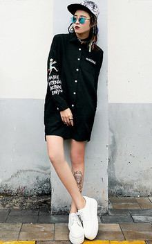 BF风长款衬衫,黑色底白色印花的强烈对比,非常有个性,透气性好,搭配一双休闲鞋,秒变潮流达人