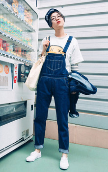 宽松的短袖T恤,内搭一款条纹衫,这样穿很特别,下身搭配背带牛仔裤,卷边的设计,帅气时髦。