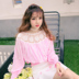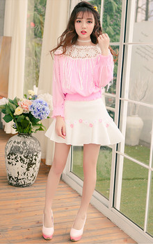 甜美可人的短款雪纺衫,浪漫蕾丝边拼接,动感流苏装饰,粉嫩嫩的色彩,非常的甜美淑女,搭配太空棉花朵装饰半身裙,小女人极了