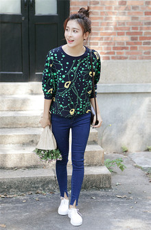 波点花朵图案、蝙蝠袖设计的圆领套头卫衣,搭配一条开叉裤脚牛仔裤,修身显瘦,活泼动感,展现出你的甜美一面。