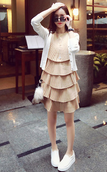 文静淑女气质的雪纺连衣裙,风琴褶裙摆及领子设计,很可爱很时尚,柔美可人,秀出乖乖女的模样,搭配双休闲单鞋,青春时尚