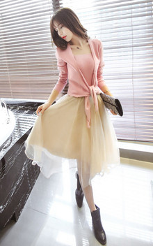 针织开衫+网纱抹胸裙,好穿时尚,两件套连衣裙的设计,搭配抹胸裙和粗跟马丁靴,上身效果甜美洋气,成为街头一道亮丽的风景