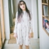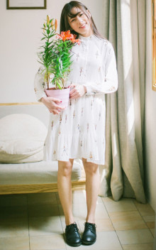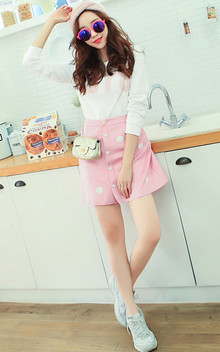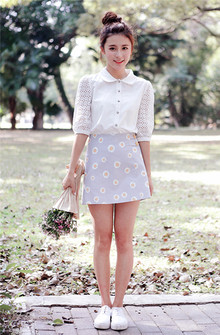 侧边纽扣装饰、配有小菊花图案的半身裙,搭配一件娃娃领镂空七分袖衬衫,突出了裙子的时尚版型,展现了你的甜美气质。