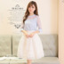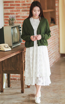 双层蕾丝连衣裙极其甜美,腰饰收腰,显出身材,外搭一件纯色针织薄开衫,完整而经典的搭配。