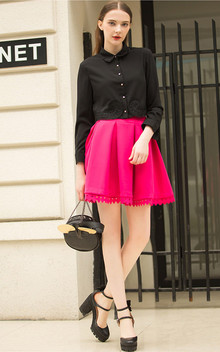 少女气息较饱满的一款衬衫,以黑色为主打色,精致的蕾丝花边附在衣摆,搭配性感短裤,时尚又优雅