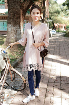 高腰开叉流苏下摆连衣裙,搭配一条开叉裤脚牛仔裤,富有肌理感觉,衬托你的俏丽迷人身材,展现出甜美风格。