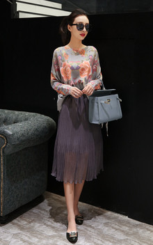 很漂亮的一款蝙蝠衫,印花的设计,甜美的同时又遮肉肉,搭配百褶半身裙,透视的效果,女人味十足!