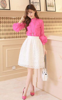 小清新的衬衫,镂空的袖子,散发迷人的气息,很有韵味,搭配简单的半身裙,褶皱处理,女人味十足!