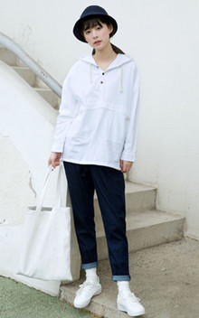 连帽的设计外套,流露出俏皮气息,略显休闲韵味,再搭配宽松的休闲裤,清新文艺。