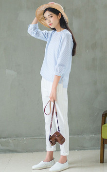 蓝白相间的t恤颇为简洁,透着小清新的意味,展现出随性自然的休闲气质,搭配白色哈伦裤,自然甜美。