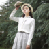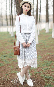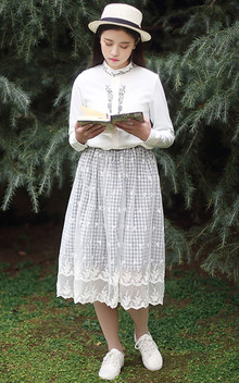 明媚柔和的白衬衫,左胸处小贴袋,干净利落,搭配半身蕾丝裙,带着淡淡的文艺书卷气息。