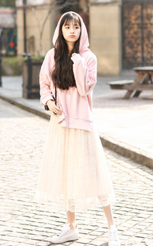 很显白很耐看也很气质的蜜桃粉连帽卫衣,搭配杏色的蕾丝半身长裙,清新又充满活力,穿上立刻想去春游有木有?