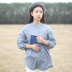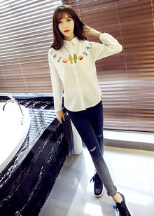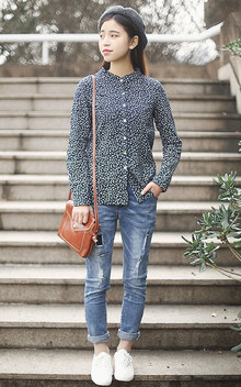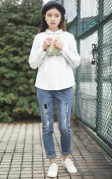 基本款的衬衫,简单干净,是合身的小宽松版型,搭配补丁牛仔裤,文艺清新。