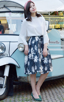 春款喇叭袖雪纺衫,直筒衣身的设计掩盖了多余的赘肉,面料柔软透气性好,搭配一条半身裙,简约又不失特色
