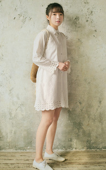 森系文艺衬衫裙,全棉材质,手感柔软,上身舒适,衣衣镂空及波浪式袖口、裙摆,很精美,配上一双小白鞋,森系feel十足!