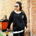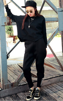 简单大气的卫衣,整件纯黑色,胸前很小的字母刺绣让人眼前一亮,前短后长两侧开叉的设计很有特色,配上黑色哈伦裤,街头范十足