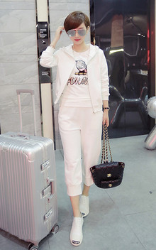 时尚的亮片上衣+松紧腰七分裤女套装,修身显瘦有气质,搭配印花短袖T恤和休闲鞋,时髦又有型。