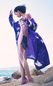 富有中国文化蕴味的长款风有,薄款,搭配修身款的方领丝绒喇叭袖连衣裙展现优雅时尚