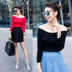 纯色一字领打底,锁骨微露搭配清新的牛仔半身裙,简约搭配的装扮,逛街约会都美美哒~