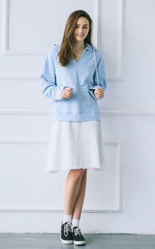 清新的连帽卫衣,口袋的装饰,简单实用,上身很不错,搭配牛仔半身裙,毛边的设计,休闲大气。