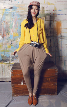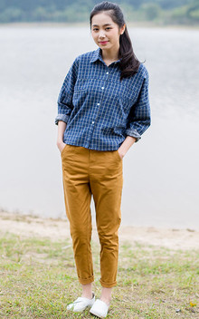 复古的V型小立领,简单的衬衫款也能很有范,搭配抵挡哈伦裤,休闲舒适。