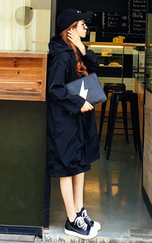 宽宽大大,超有范的中长款风衣外套,点缀字母印花,休闲连帽款,尽显街头潮范,内搭个性印花T恤,下着牛仔短裤,非常有范