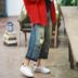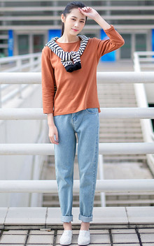 稍宽松的版型经典百搭条纹衫外穿内搭都可以,搭配修身版型,小脚裤型的破洞牛仔裤和人字拖,休闲又时尚