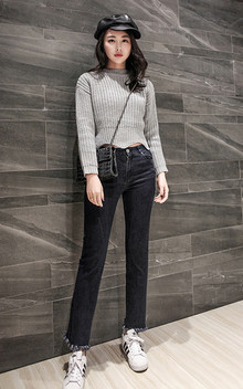 时尚短款毛衣,下摆收腰设计,修饰完美小蛮腰,搭配休闲牛仔裤,毛边的装饰,凸显优雅的女人味。