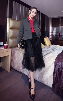 简洁干练的短外套,版型很好,内搭漂亮的波点衬衫,下身搭配一条优雅的半身裙,透视的效果,唯美动人。