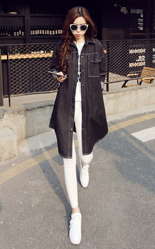 简约的翻领设计休闲大方~个性圆弧宽大下摆穿着更加时尚有型~搭配简约短袖T恤+显瘦休闲打底裤+系带平底低帮鞋鞋子!