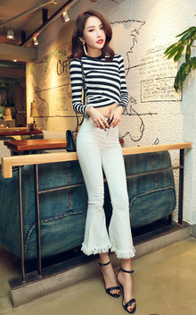 很不错一款上衣,有点透视的效果,展现女人的迷人魅力,搭配做旧牛仔裤,毛边的装饰,个性潮流。